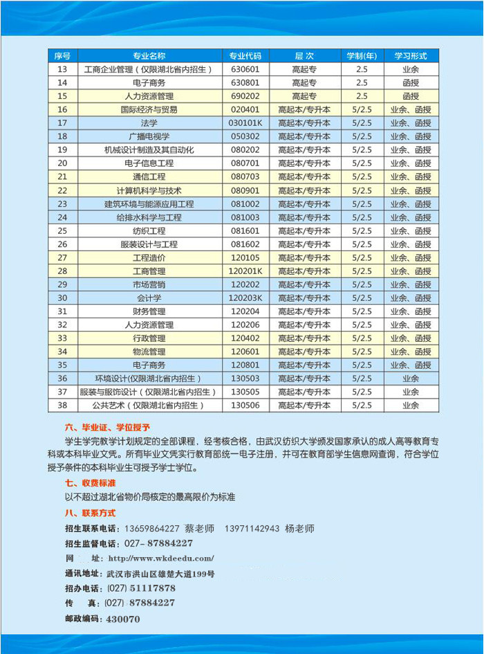 武汉纺织大学成人高等学历教育2019年招生简章