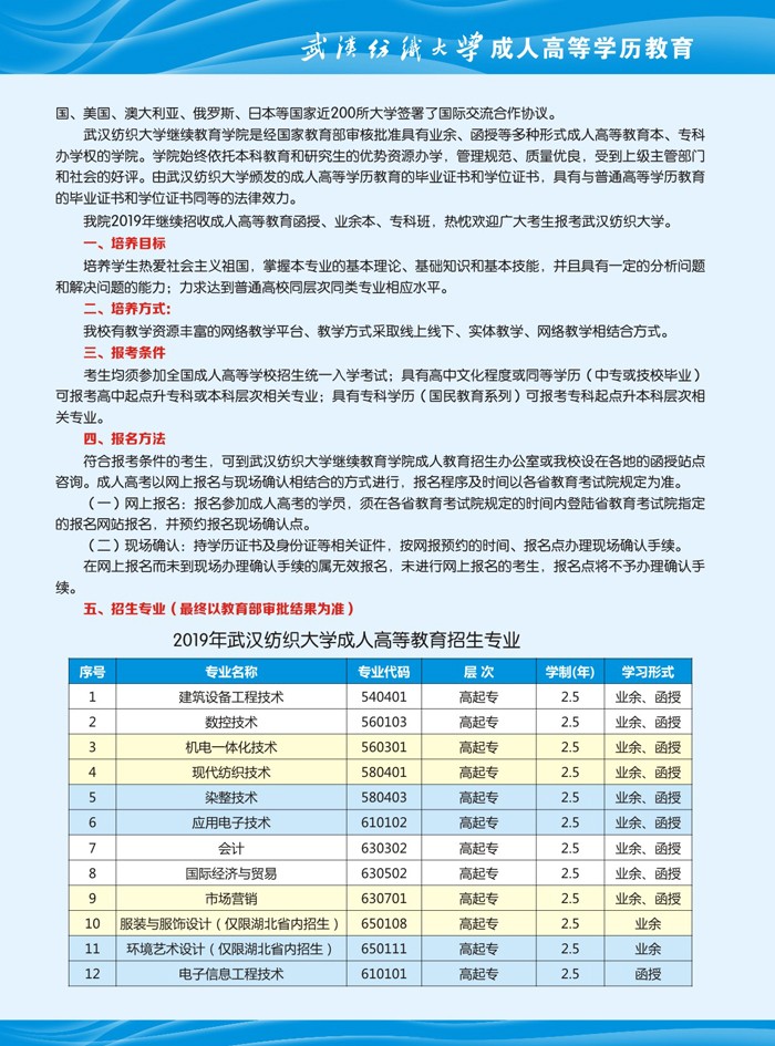 武汉纺织大学成人高等学历教育2019年招生简章