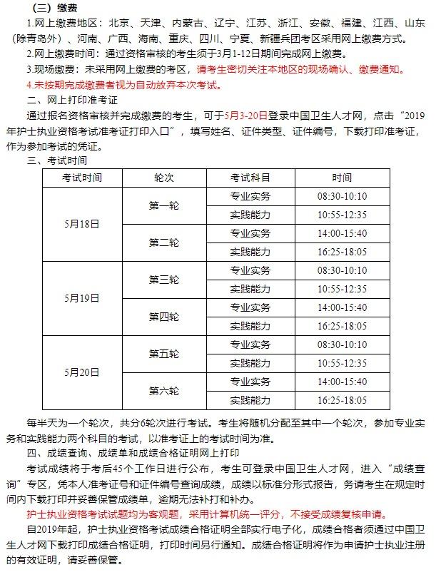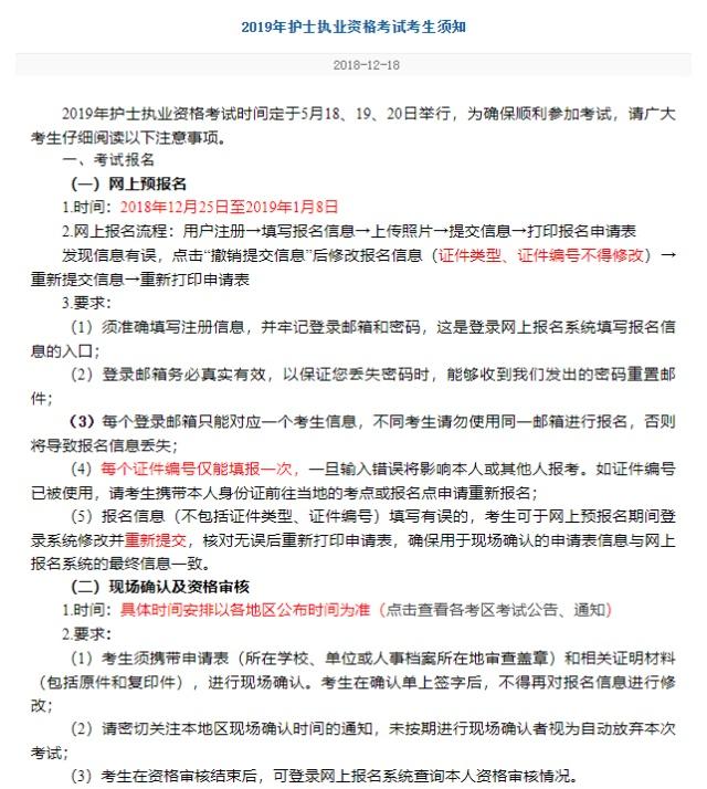 昨日(12月18日)《中国卫生人才网》正式公布了《2019年护士执业资格考试考生须知》。明确了网报名时间为2018年12月25日至2019年1月8日,考试时间定于2019年5月18、19、20日举行。